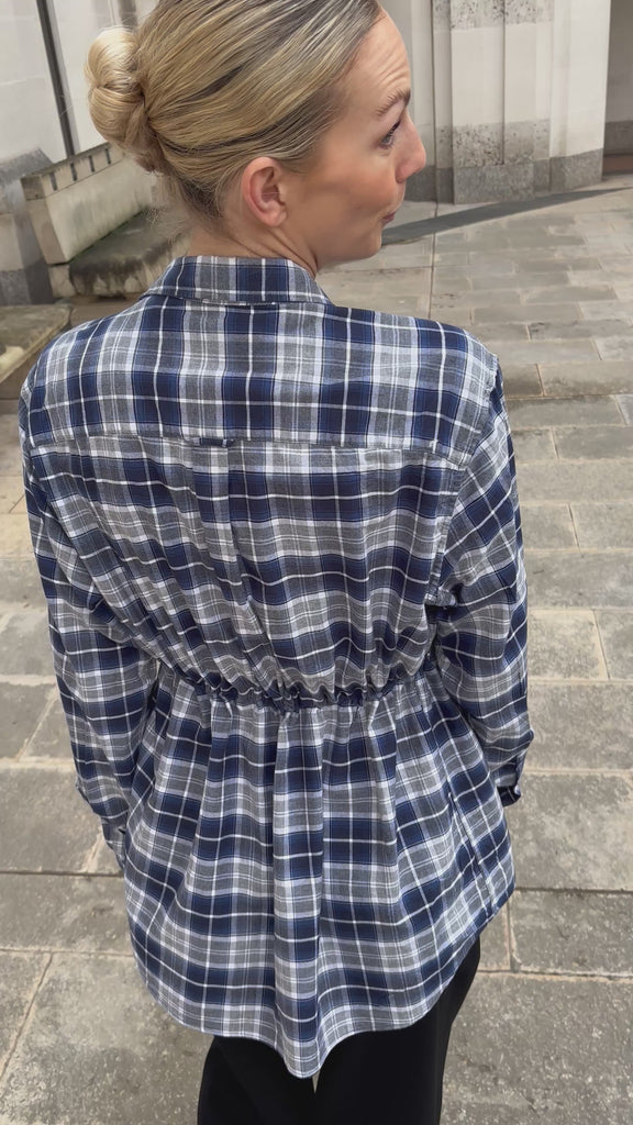 This upcycled shirt features a drawcord channel at the waist, allowing you to cinch in the volume for a flattering, sculpted fit. Thoughtfully designed, it combines classic tailoring with modern, versatile style, adding subtle texture and visual interest to everyday wear.